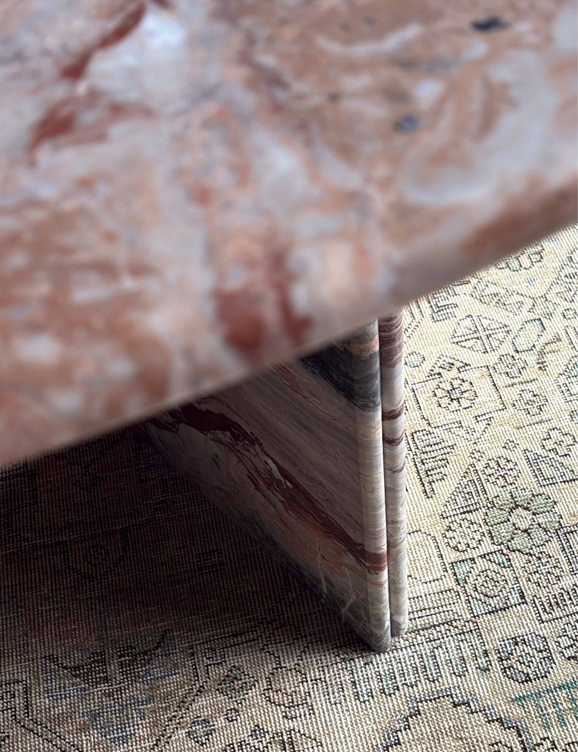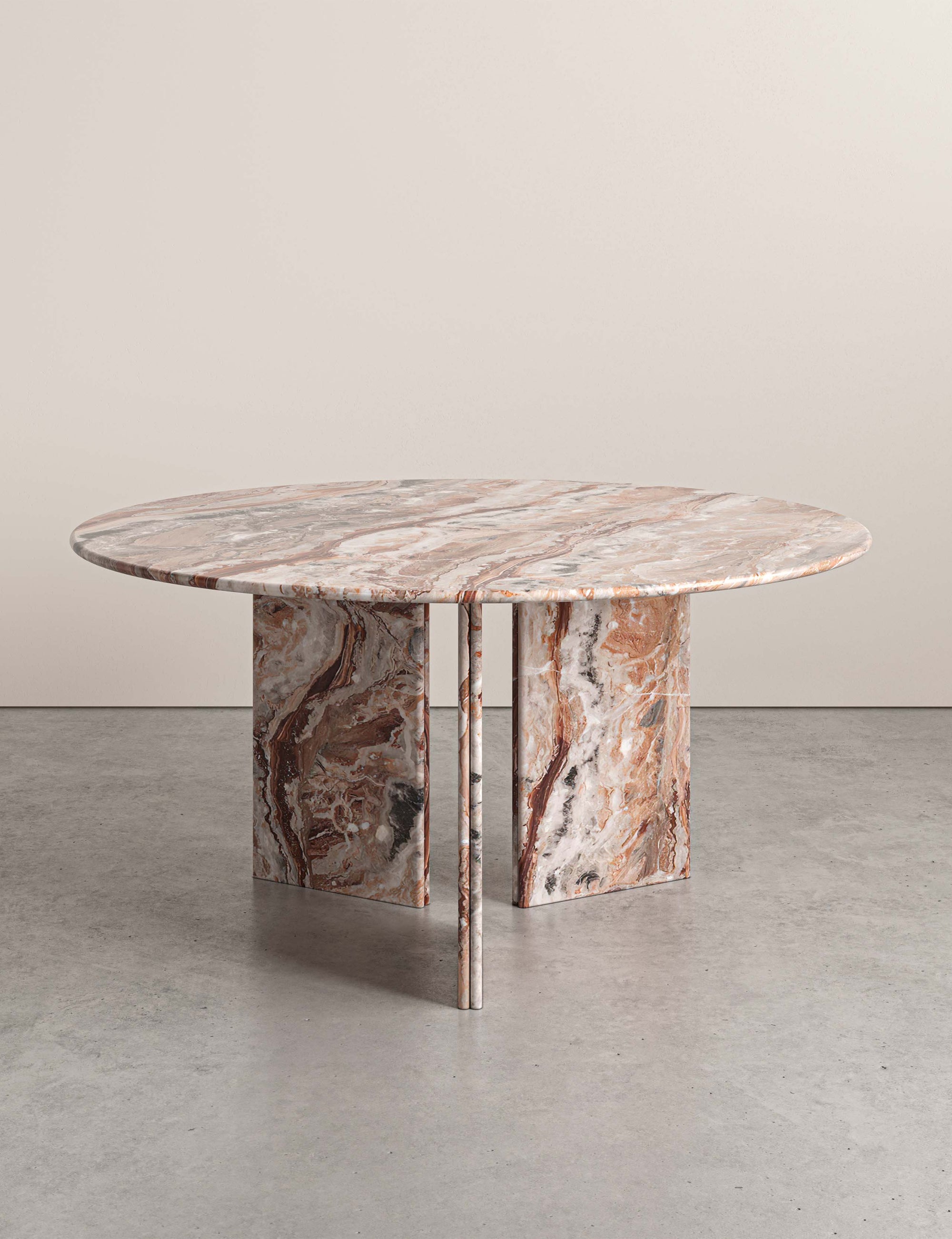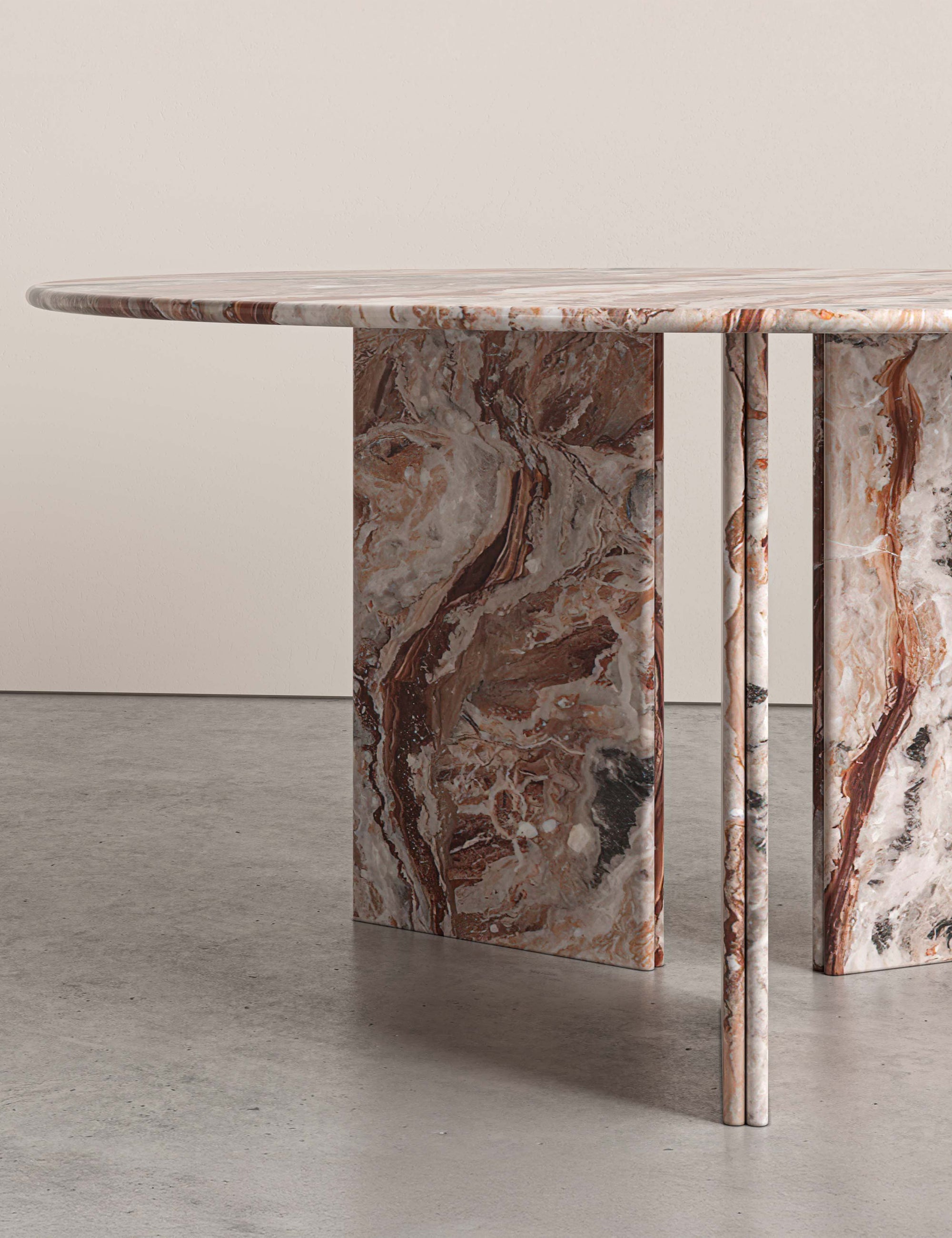 De Arc-eettafel vormt een opvallend middelpunt in elke eetruimte. De sculpturale uitstraling wordt bepaald door dubbel afgeronde tafelpoten met een centrale opening, wat een subtiel gevoel van lichtheid en balans geeft. Hier getoond in Arabescato Rosso-marmer met een diameter van 150 cm; andere steensoorten en afmetingen zijn op aanvraag verkrijgbaar. Met de hand gemaakt op bestelling door Italiaanse ambachtslieden in Italië.