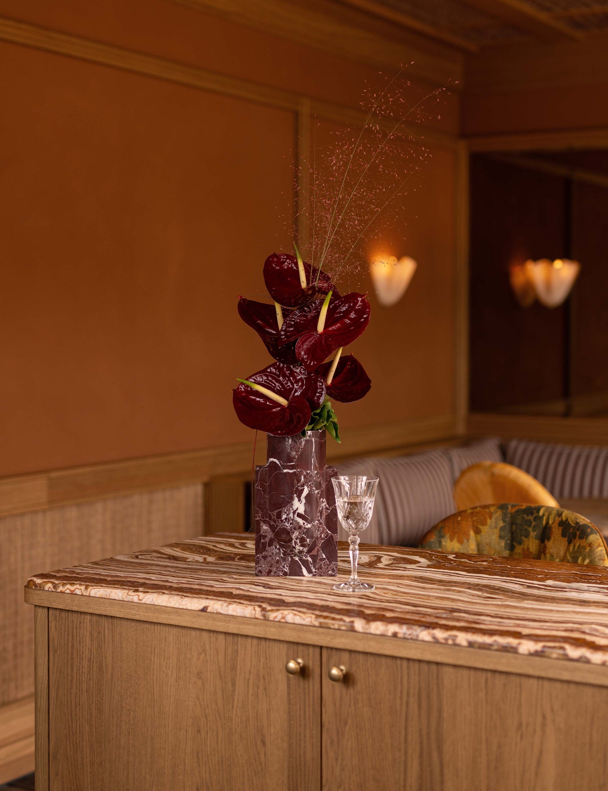 Verfraai je ruimte met de gedurfde elegantie van onze sculpturale Caleo vaas, vervaardigd uit Rosso Levanto Marmer, geprezen om haar diepe bordeauxrode tinten en opvallende witte aderen. Elk stuk is uniek, vervaardigd met architectonische precisie en minimalistische intentie. Dankzij de strakke, geometrische vorm en de rijke textuur is het niet alleen een functionele vaas, maar ook een indrukwekkend sculpturaal statement. Of je de vaas solo presenteert of combineert met een eenvoudige bloemencompositie, Caleo voegt persoonlijkheid toe aan je ruimte.