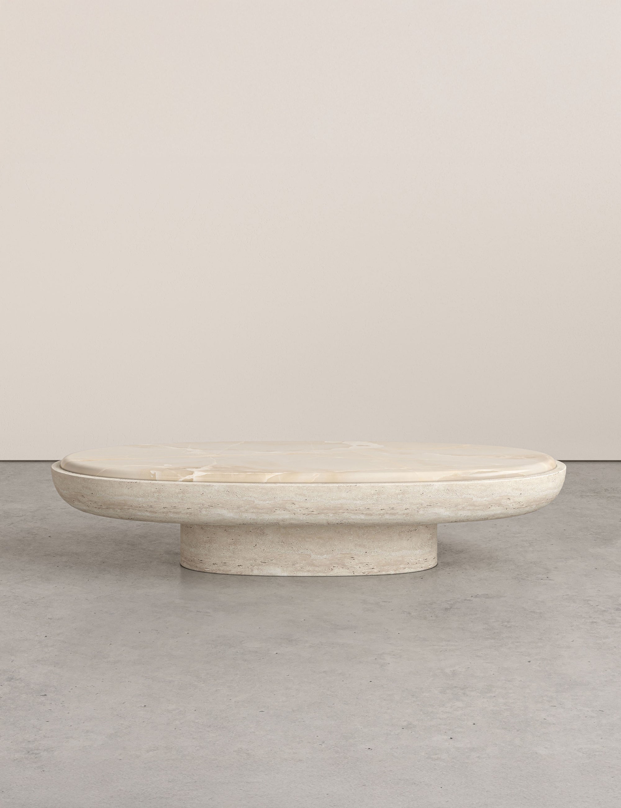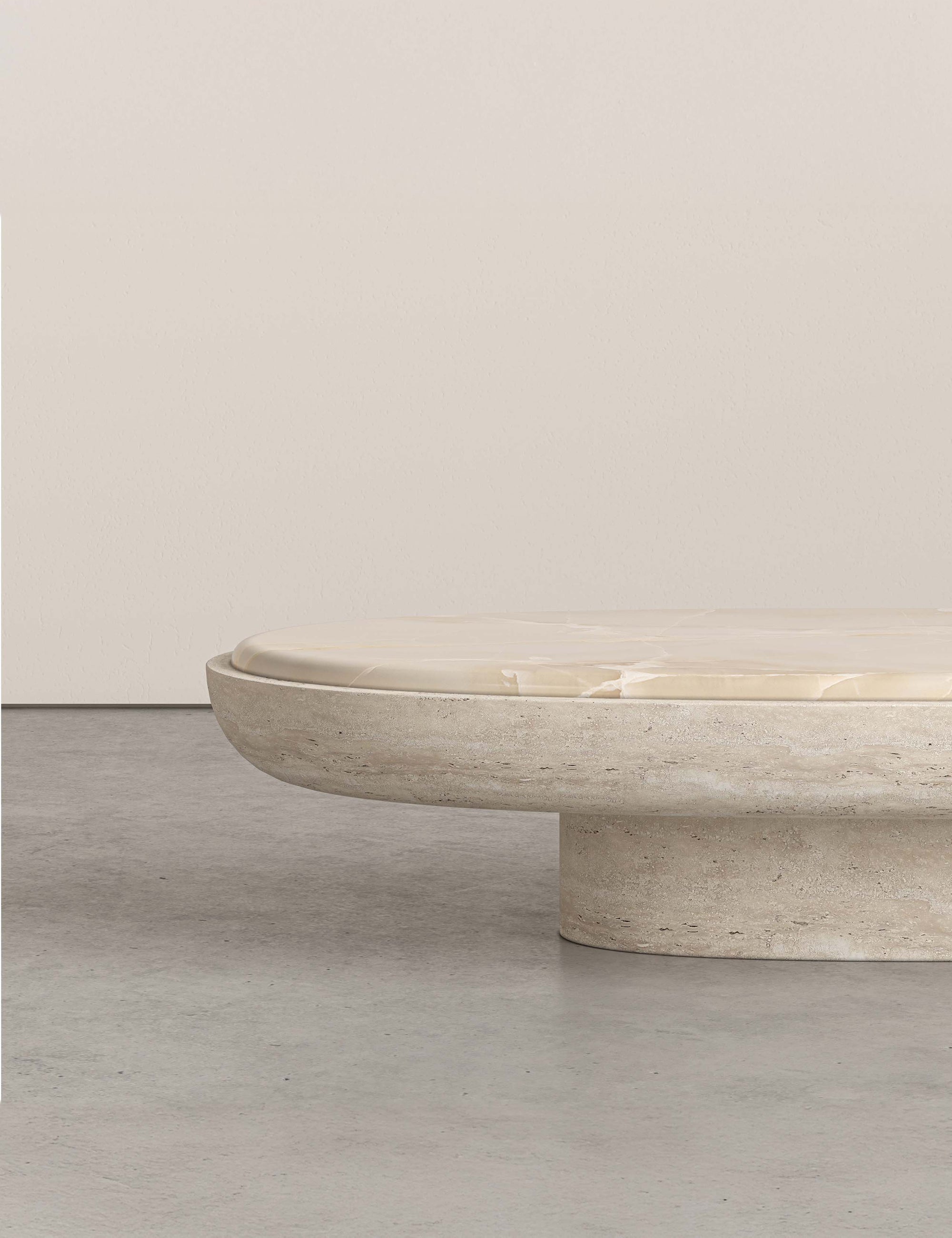 De Orb-salontafel is een opvallend, sculpturaal middelpunt dat ontworpen is om de aandacht te trekken. Het minimalistische silhouet benadrukt de natuurlijke schoonheid van de materialen: glanzend wit onyx gecombineerd met ruw, getextureerd travertijn. Het resultaat is een zeldzame en betoverende balans tussen verfijning en organisch karakter. Met zijn subtiel futuristische, door een ufo geïnspireerde vorm onderscheidt het zich als een werkelijk uitzonderlijk stuk. Verkrijgbaar in op maat gemaakte steensoorten en afmetingen op aanvraag.