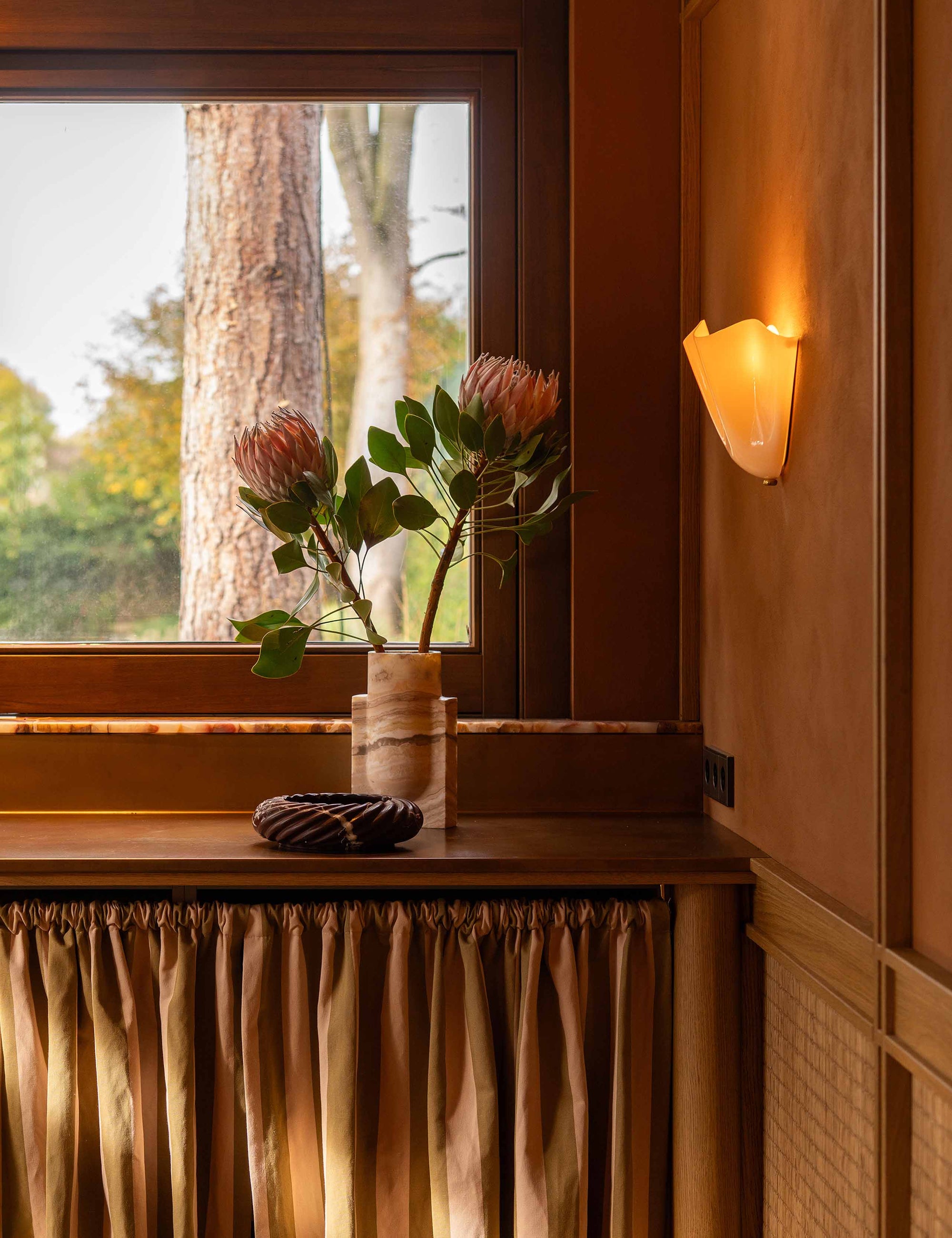 Elevate your space with the serene refinement of our sculptural Caleo vase. Crafted from Desert Linea Onyx, celebrated for its warm sandy hues and subtle flowing veining. Each piece is one-of-a-kind, carved with architectural precision and a minimalist sensibility. Its clean geometric profile and exquisite texture make it both a functional vessel and a striking sculptural accent. Whether displayed on its own or paired with a simple arrangement, the Caleo vase infuses any room with understated luxury and timeless warmth. The vase comes with a glass insert so it is 100% waterproof.